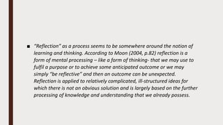 The document discusses the significance of reflection in personal and professional development, highlighting how it broadens perspectives and enhances methodology. It describes various models of reflective practice, including Gibbs' and Driscoll's models, which facilitate learning from experience through structured reflection. Additionally, it emphasizes the importance of collaborative reflection to gain diverse insights and improve problem-solving in complex situations.