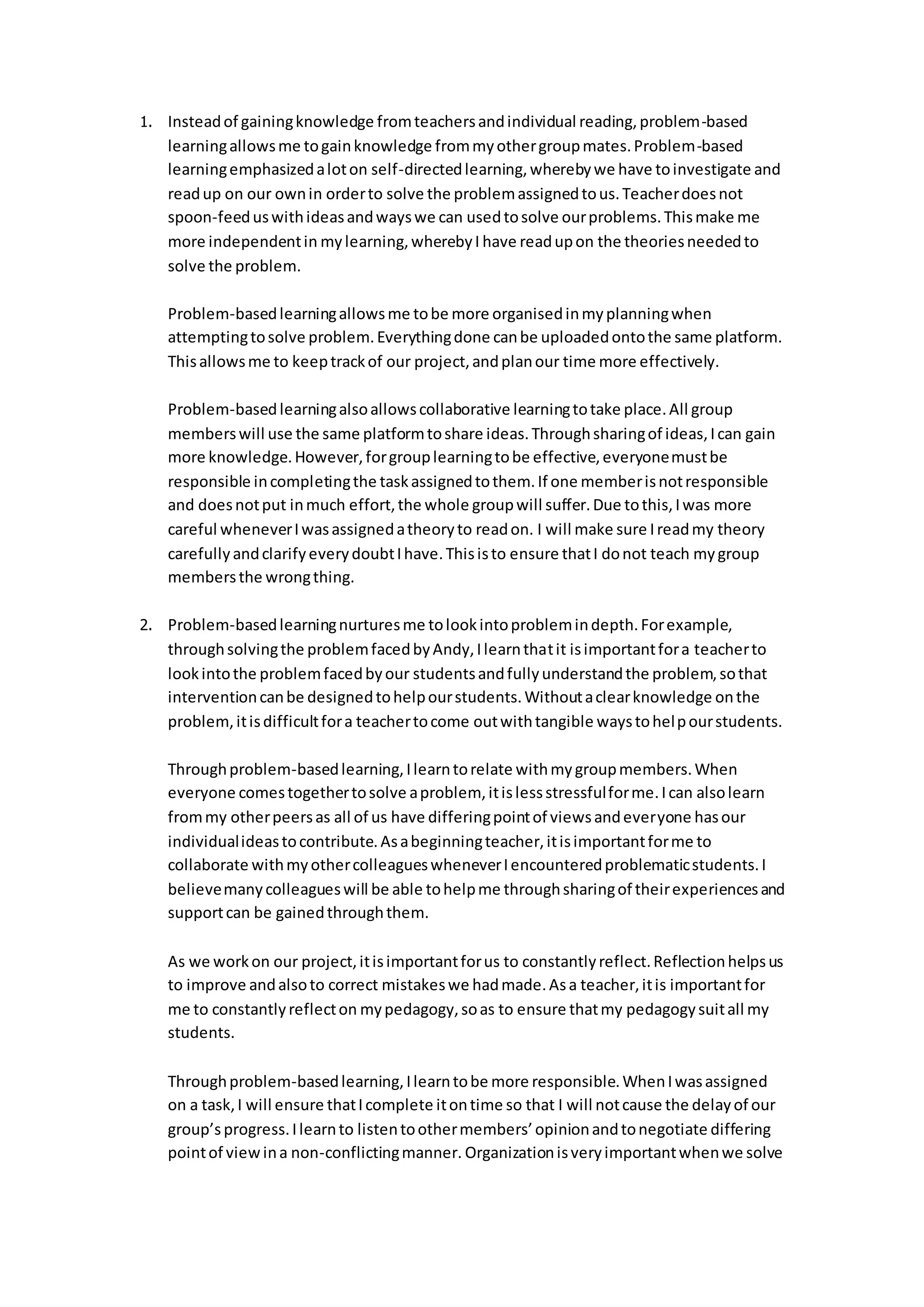 This document discusses the benefits of problem-based learning from the perspective of a student. It notes that problem-based learning allows students to gain knowledge from peers through collaboration and self-directed investigation of problems. It emphasizes organization and time management. The document also reflects on how problem-based learning helps nurture skills like in-depth problem solving, collaboration, responsibility, and reflection that will be important for the student's future career as a teacher. It provides some suggestions such as providing more training on using collaborative platforms and ensuring project organization through regular group meetings.