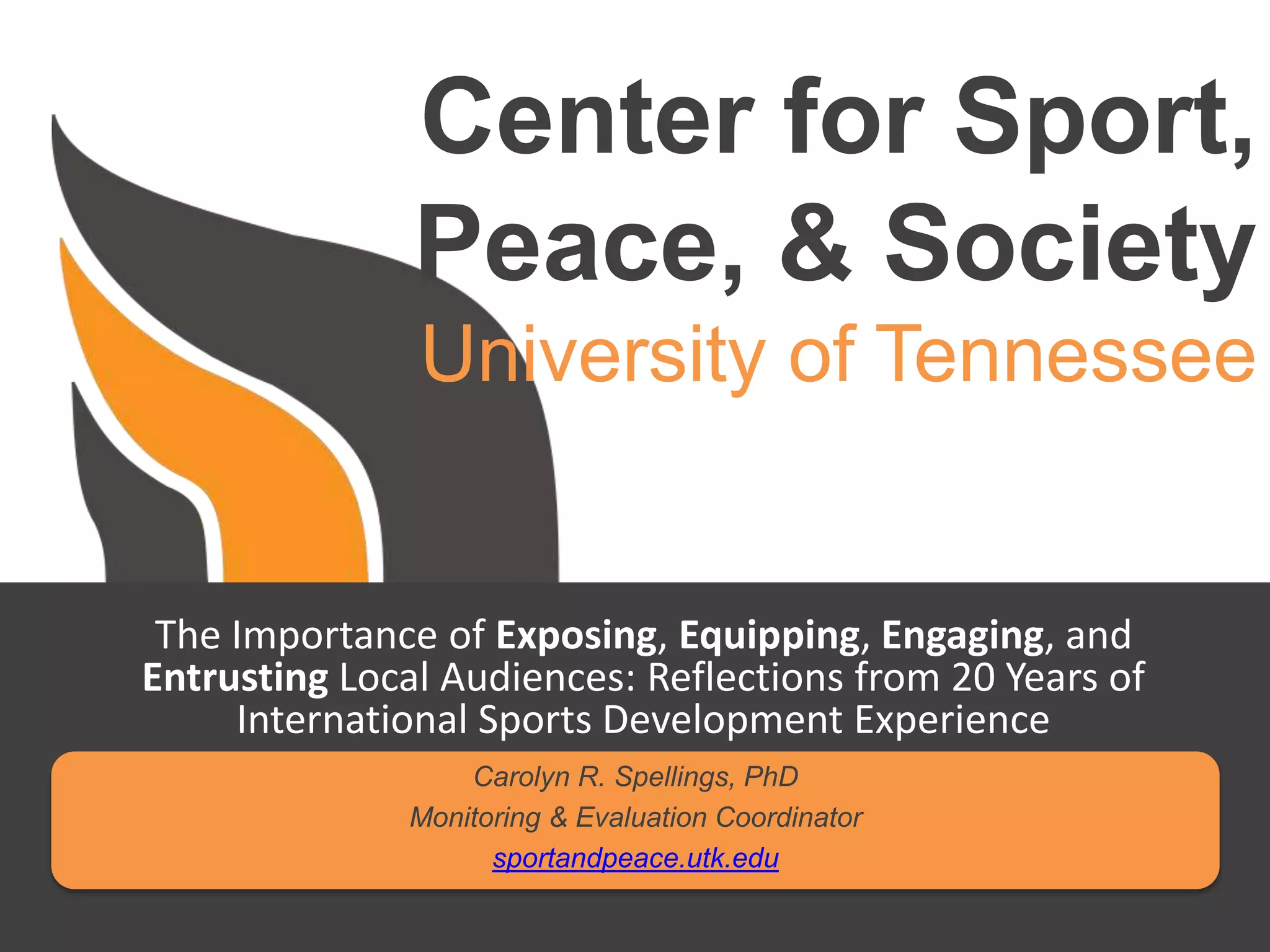 The document discusses the Center for Sport, Peace, and Society's (CSP) 4-E Model of Empowerment for international sports development programs. The model aims to expose local participants to new resources and connections, equip them with leadership skills to address community issues, engage them through service learning and reflection, and ultimately entrust them to carry out their own visions for change. Using this model over 20 years, CSP has created culturally sensitive programs with high implementation rates that mobilize local volunteers and engage communities.