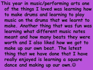 This student enjoyed various music and performing arts activities this year, including learning to make and play drums and creating their own square dances. They also loved starting their own blog and teaching others how to use various blog features. Their favorite sports introduced in PE this year included hockey, netball, cricket, and soccer. They found organizing their class's liturgy in religion class to be very fun. Their favorite library book this year was "Vicky Angel" by Jacqueline Wilson. The student looked forward to camp and meeting their buddy for next year.