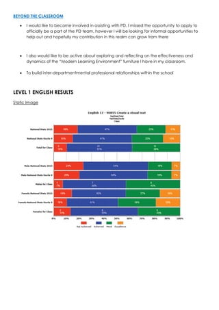 For 2016, their goals are to improve results to match the decile 9 averages and achieve more excellences. Their main strategy involves conferencing with students weekly to provide feedback on their work and checking in with each student during lessons to support understanding. They also aim to simplify in-class tasks while allowing time for assessments and feedback. Beyond teaching, they want to assist with professional development and explore the effectiveness of their classroom furniture.