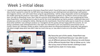 Elinor created a clothing brand and promotional materials for her final major project. In her reflective diary, she discusses her initial plans, research process, production experiments, challenges faced, and final outcomes. Some highlights included enjoying creating her mood board and analyzing inspiration brands. Her disposable camera photos did not turn out as hoped, so she used iPhone photos instead. Feedback led to changes in her magazine poster design. Overall, she found the project enjoyable and a good introduction to her future career interests.