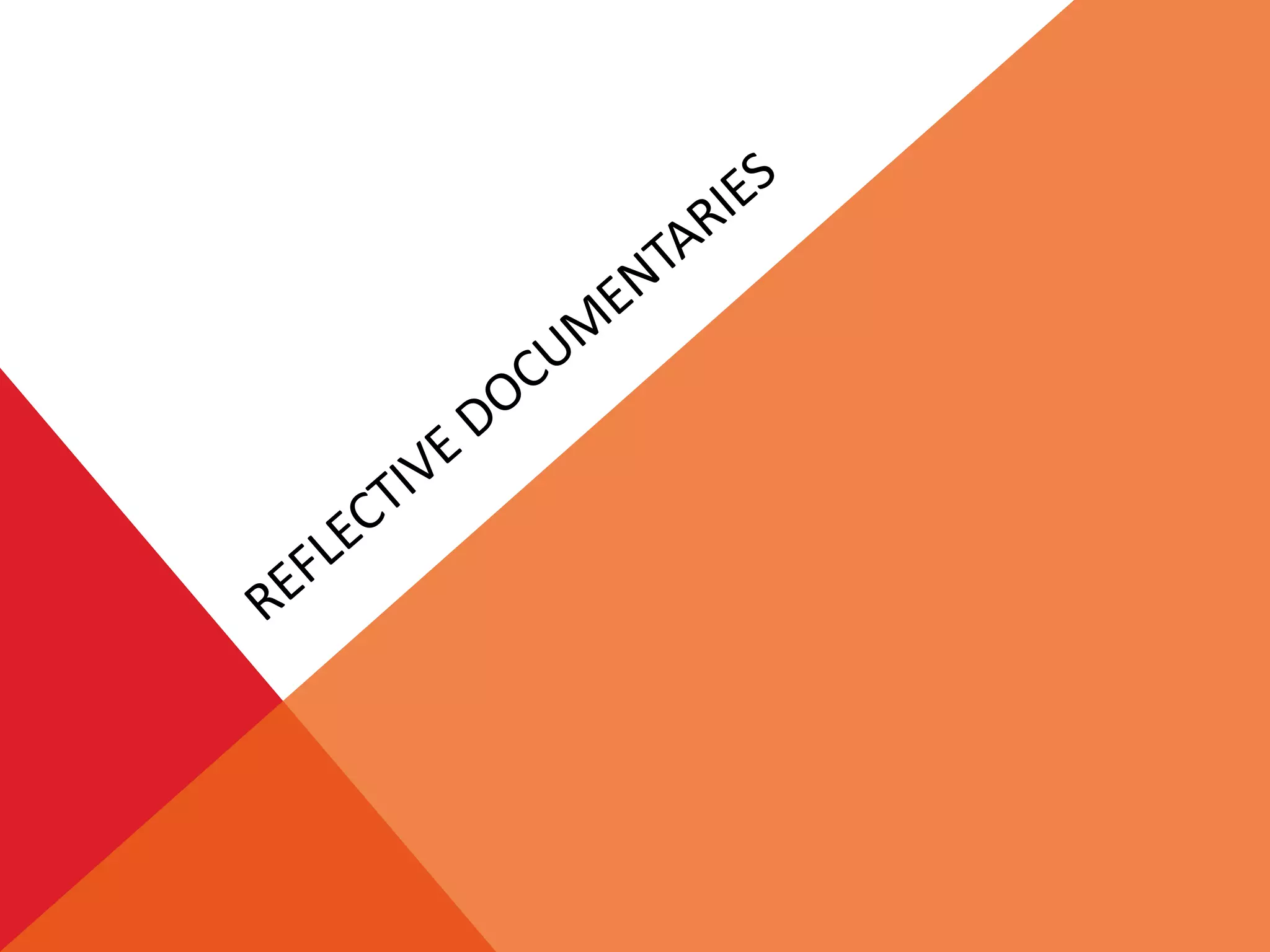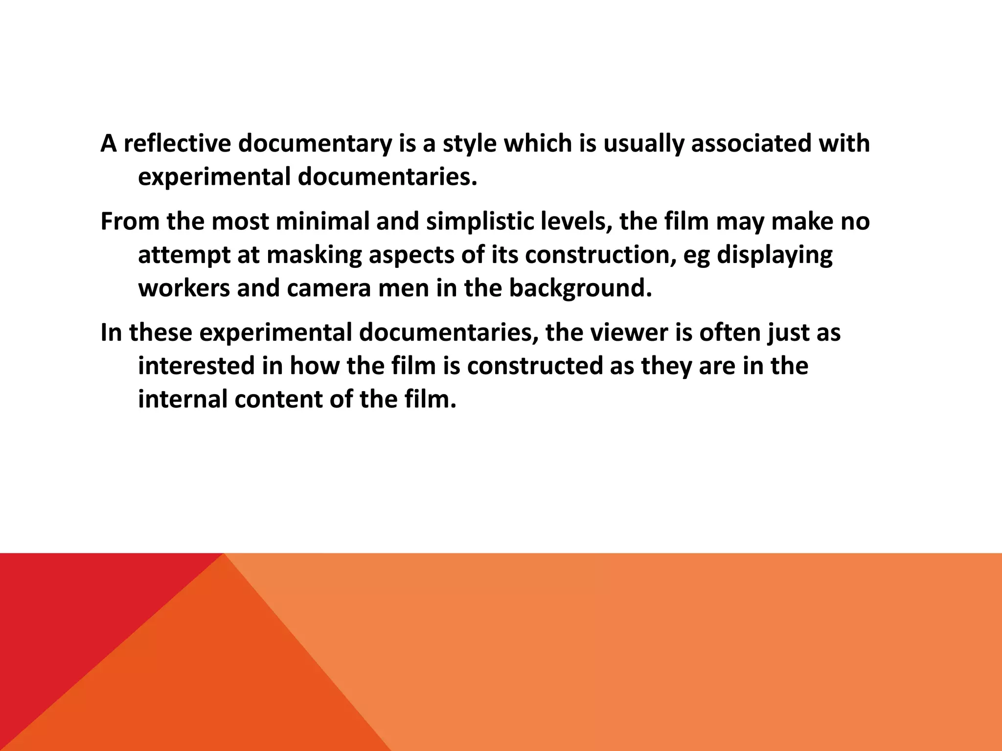 A reflective documentary is an experimental style that does not hide its construction, sometimes showing crew members. The audience is as interested in how the film is made as in its content. It aims to be truthful by focusing on realism and using minimal editing and effects. A reflective filmmaker like Louis Theroux narrates over real footage and directly addresses the audience, aiming to influence their opinions similar to his own through sharing the problems he faced making the documentary.