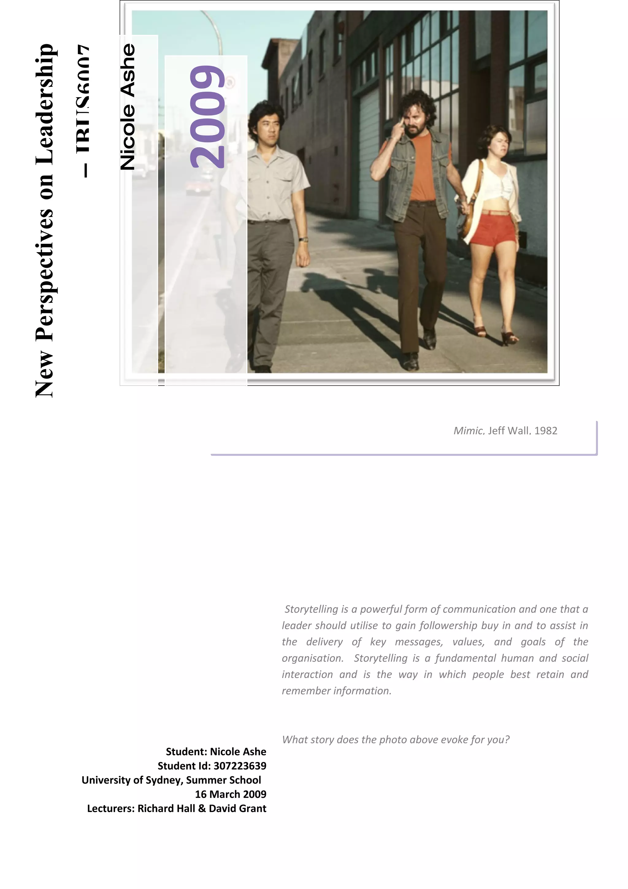 This document summarizes Nicole Ashe's reflective essay on her New Perspectives on Leadership course. The essay discusses several key concepts from the course, including storytelling, ethics, transformational and authentic leadership, followership, and art. Nicole found that storytelling, a focus on ethics, cultivating authenticity and trust with followers, and embracing creativity are hallmarks of effective leadership. She plans to incorporate these ideas, like using storytelling to communicate messages and sharing stories to build understanding, into her own leadership approach.