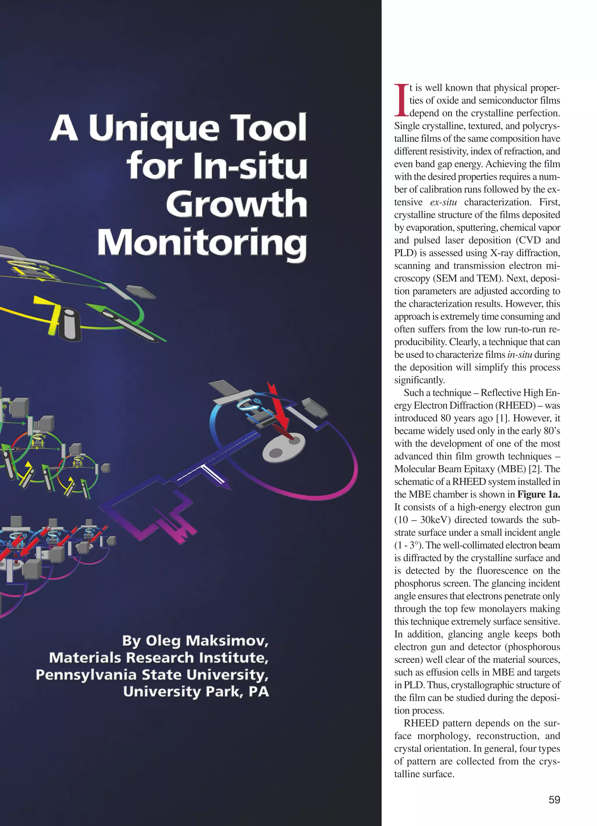 This document discusses Reflective High-Energy Electron Diffraction (RHEED), a technique used to characterize thin films in-situ during deposition. RHEED works by directing a high-energy electron beam at the substrate surface at a low angle. The diffracted beam provides information on the film's crystalline structure and surface morphology. RHEED patterns indicate whether a film is single crystalline, polycrystalline, or textured. Oscillations in the RHEED intensity during growth also allow real-time measurement of deposition rates. Advances now enable RHEED to be used at higher pressures, making it suitable for characterizing a wider range of deposition methods.