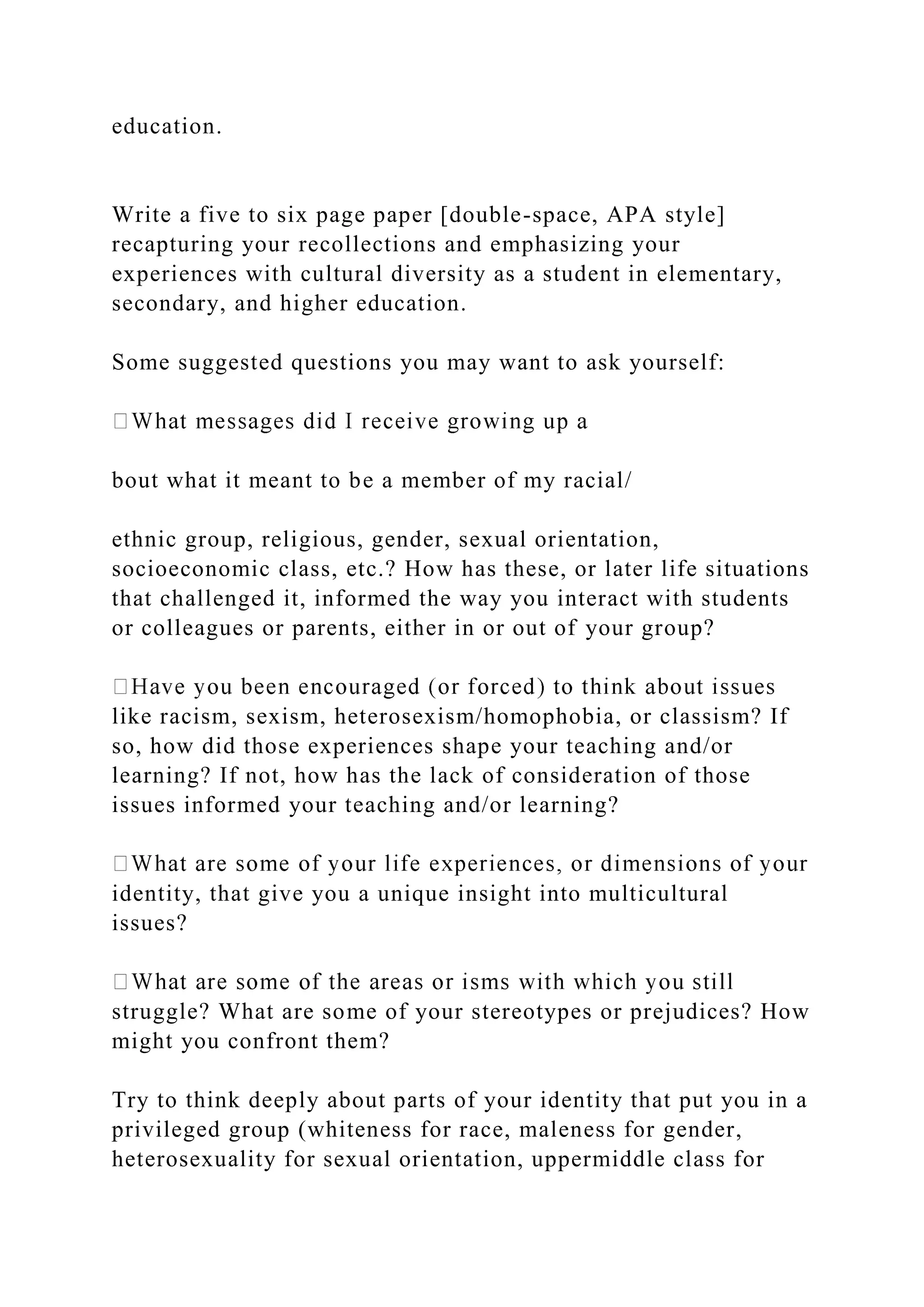 The document outlines the assignment for a reflective personal development paper focused on the student's life experiences that shape their views on race, culture, and diversity in education. It encourages students to research their family background and reflect on their cultural experiences, reiterating the importance of understanding one's identity and its impact on teaching diverse populations. The paper requires a structured format, including family history, cultural experiences, and reflections on how these elements inform current educational practices and perspectives on multicultural issues.