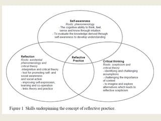 Reflection has its origins in ancient philosophy and is an important part of human development and learning. The purpose of reflection is to improve professional practice by critically examining experiences. It requires skills like self-awareness, open-mindedness, and honesty. Reflection leads to personal and professional growth as practitioners gain insight, make changes, and improve their competence over time. Different models emphasize aspects like critical analysis, planned change, and reflecting both during and after experiences. Overall reflection is a valuable tool for practitioners to continuously learn and enhance their skills.
