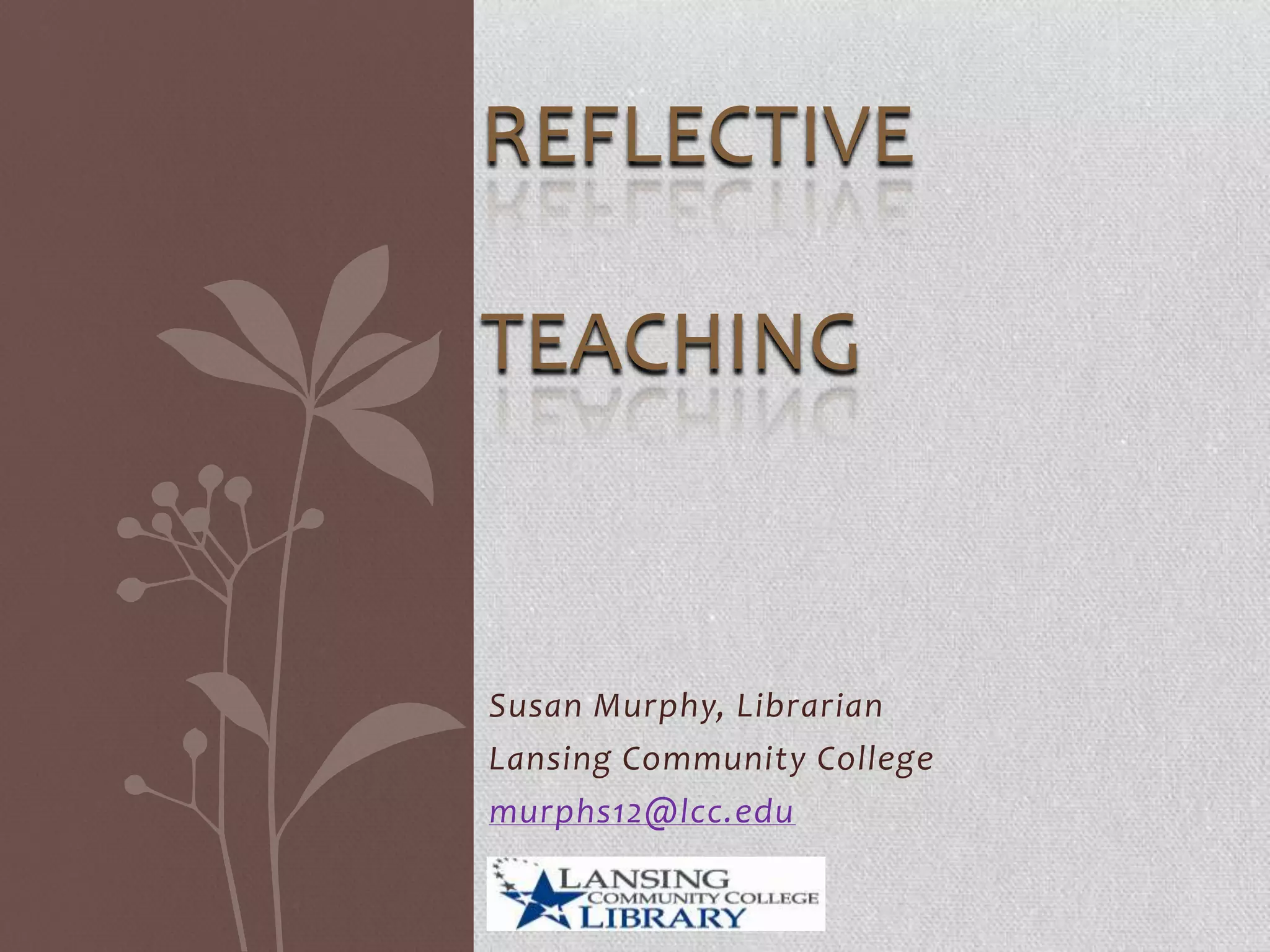 This document discusses reflective teaching techniques for librarians. It provides information on journaling methods like free writing and using focused questions. Peer observation is described as an important reflective practice that involves preparation, observation, and post-observation discussion. Guidelines for effective peer observation include establishing goals and areas of focus. Additional reflective tools mentioned include teaching circles, video recording, portfolios, and combining various methods. Barriers to reflection like lack of time are addressed, and the document emphasizes that regularly reflecting on teaching is most important, regardless of method.