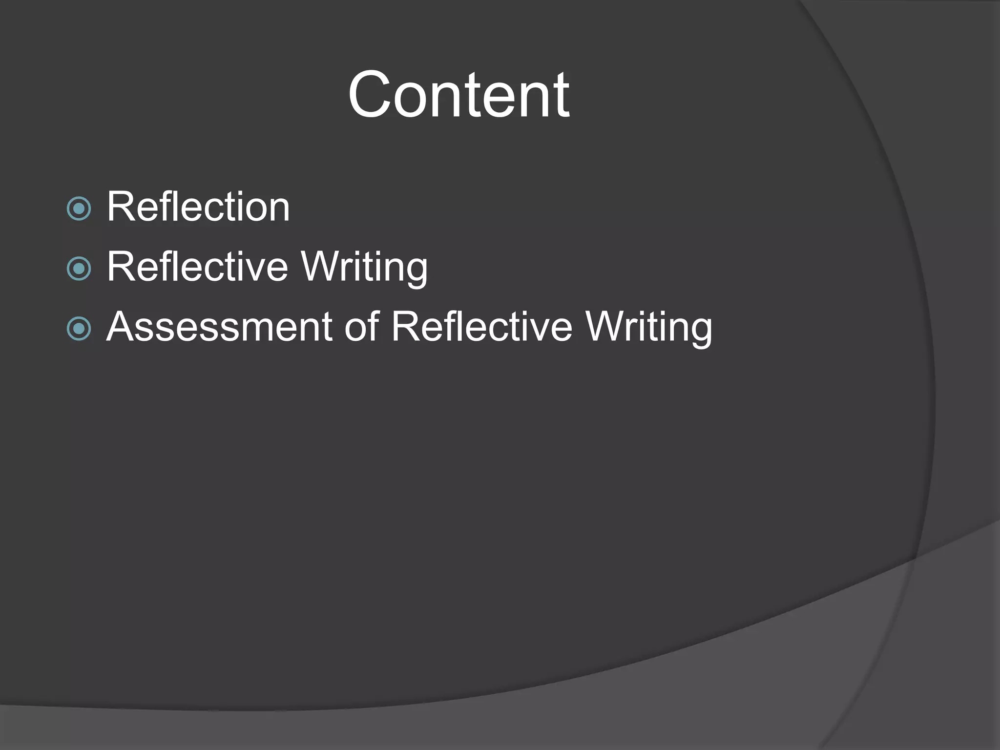 This document discusses reflection and reflective writing. It defines reflection as consciously thinking about and analyzing past experiences. Reflection allows practitioners to learn from experiences. The document outlines stages of reflective writing, including describing an event, attending to feelings, re-evaluating the experience, and determining learning outcomes. Reflective writing can help develop critical thinking, self-directed learning, and life-long learning skills important for professional development. The document provides an example of a student's reflective writing on failing exams and having to repeat the year.