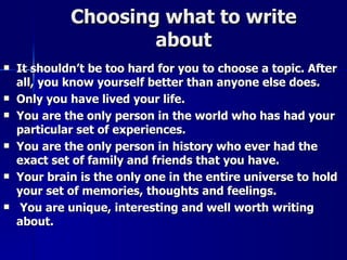 The document provides guidance on writing a personal reflective essay, including choosing a topic from one's own experiences, focusing on specific experiences or people through short paragraphs, and using details, descriptions, thoughts, feelings, and dialogue to bring the writing to life. It emphasizes reflecting on how experiences and people have shaped the writer as well as looking back on past events with new perspective and understanding.