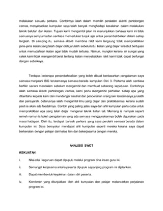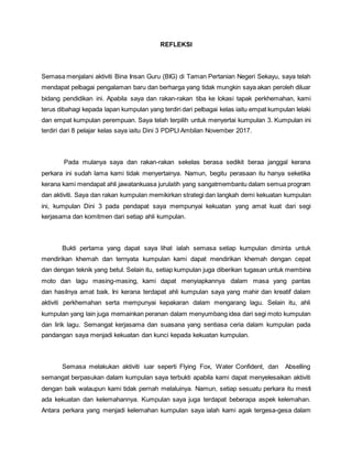 Pengalaman dalam program bina insan guru di Sekayu memberikan peluang berharga untuk kerjasama dan pembangunan diri bagi pelajar seperti penekanan pada komitmen dan kekuatan kumpulan. Meskipun terdapat kelemahan dalam pelaksanaan dan keputusan, program ini menunjukkan pentingnya mendengar nasihat dan mempraktikkan teknik yang diajar untuk peningkatan. Selain itu, program ini mengingatkan bahawa tugas guru bukan hanya di kelas tetapi juga dalam membentuk pelajar menjadi insan yang berguna.