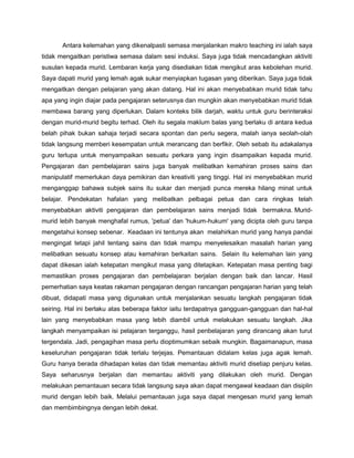 Dokumen ini menyajikan refleksi tentang pengalaman pengajaran makro, mencatat kekuatan seperti penguasaan kelas dan penggunaan teknik pengajaran yang menarik, serta kelemahan seperti kurangnya pengaitan peristiwa semasa dan pemantauan aktif terhadap murid. Penulis mencadangkan penambahbaikan dalam pengajaran melalui pemantauan yang lebih baik, pengawalan masa yang ketat, dan penyediaan bahan yang sesuai untuk kebolehan murid. Pendekatan berpusatkan murid dan aktiviti hands-on disarankan untuk meningkatkan pemahaman dan minat dalam subjek sains.