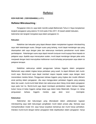 Dokumen ini adalah refleksi tentang pengalaman pengajaran mikro subjek matematik untuk tahun 2. Kekuatan pengajaran termasuk kelantangan suara dan penggunaan bahasa Inggeris yang mudah difahami, sementara kelemahan utama adalah kurangnya penglibatan murid. Langkah mengatasi kelemahan dicadangkan melibatkan interaksi langsung dengan bahan pengajaran untuk meningkatkan pemahaman dan ingatan murid.