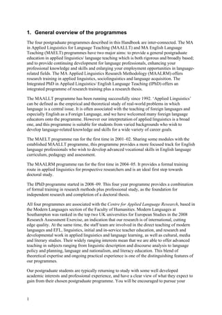 The document outlines four interconnected postgraduate programs in applied linguistics and English language teaching: MA in Applied Linguistics for Language Teaching, MA in English Language Teaching, MA in Applied Linguistics Research Methodology, and Integrated PhD in Applied Linguistics/English Language Teaching. Each program aims to enhance professional knowledge and skills for language-related fields, offering both full-time and part-time study options, rigorous coursework, and the opportunity to conduct research. The programs are designed for language professionals and educators, utilizing a blend of theoretical and practical approaches to prepare students for advanced roles in the field.