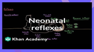 The document discusses neonatal reflexes in newborns. It defines reflexes as involuntary responses to stimuli that do not require conscious thought. It describes 17 different reflexes that are present in newborns, including rooting, sucking, Moro/startle, tonic neck, palmer grasp, stepping/dance, cough, withdrawal, parachute, tendon, and blink reflexes. The reflexes are categorized as either temporary reflexes that disappear during the first year or permanent reflexes that remain throughout life. The document provides details on the stimulus and response for each reflex and their implications for development.