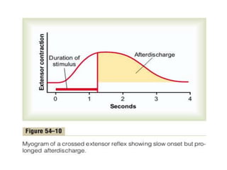 Reflexes are automatic responses to stimuli that involve a reflex arc consisting of sensory receptors, sensory neurons, processing in the central nervous system, motor neurons, and effectors. Reflexes maintain homeostasis, carry out automatic actions like swallowing and sneezing, and maintain balance and posture through spinal reflexes controlling trunk and limb muscles. There are different types of reflexes including flexor reflexes which cause limb flexion in response to stimuli, and crossed extensor reflexes which cause the opposite limb to extend about 0.2 to 0.5 seconds after a flexor reflex is elicited in one limb. Reciprocal inhibition occurs when a stretch reflex excites one muscle while simultaneously inhibiting the antagonist muscle through reciprocal innervation.