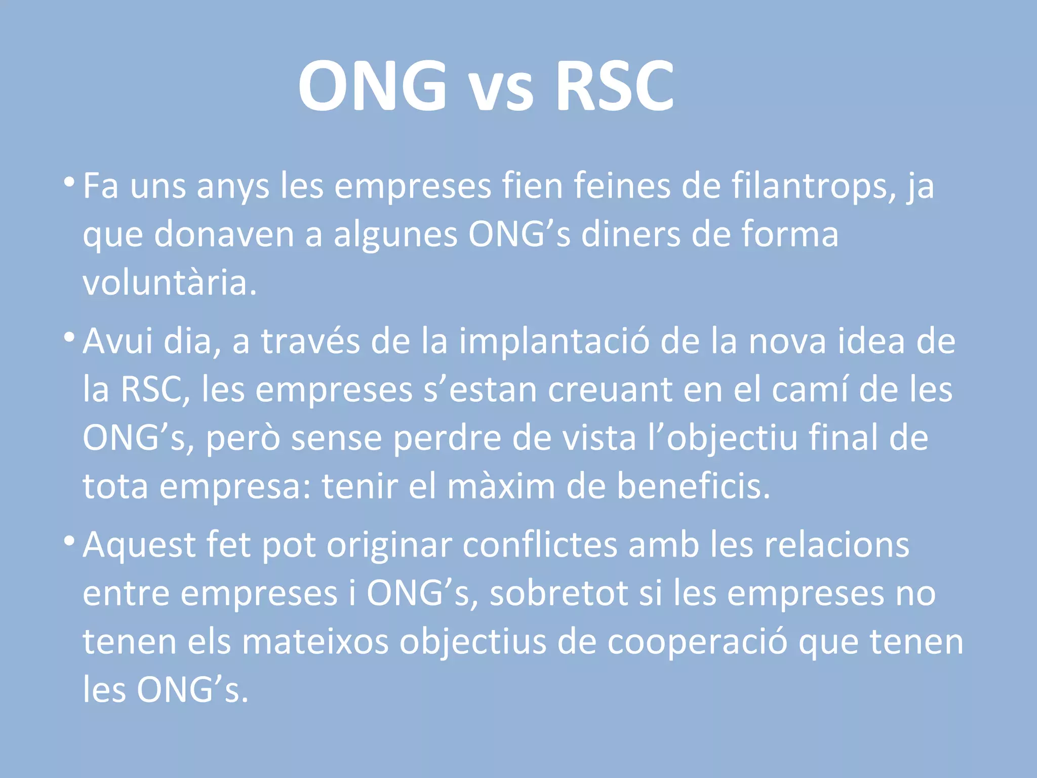 ONG vs RSCFa uns anys les empreses fien feines de filantrops, ja que donaven a algunes ONG’s diners de forma voluntària. Avui dia, a través de la implantació de la nova idea de la RSC, les empreses s’estan creuant en el camí de les ONG’s, però sense perdre de vista l’objectiu final de tota empresa: tenir el màxim de beneficis. Aquest fet pot originar conflictes amb les relacions entre empreses i ONG’s, sobretot si les empreses no tenen els mateixos objectius de cooperació que tenen les ONG’s.