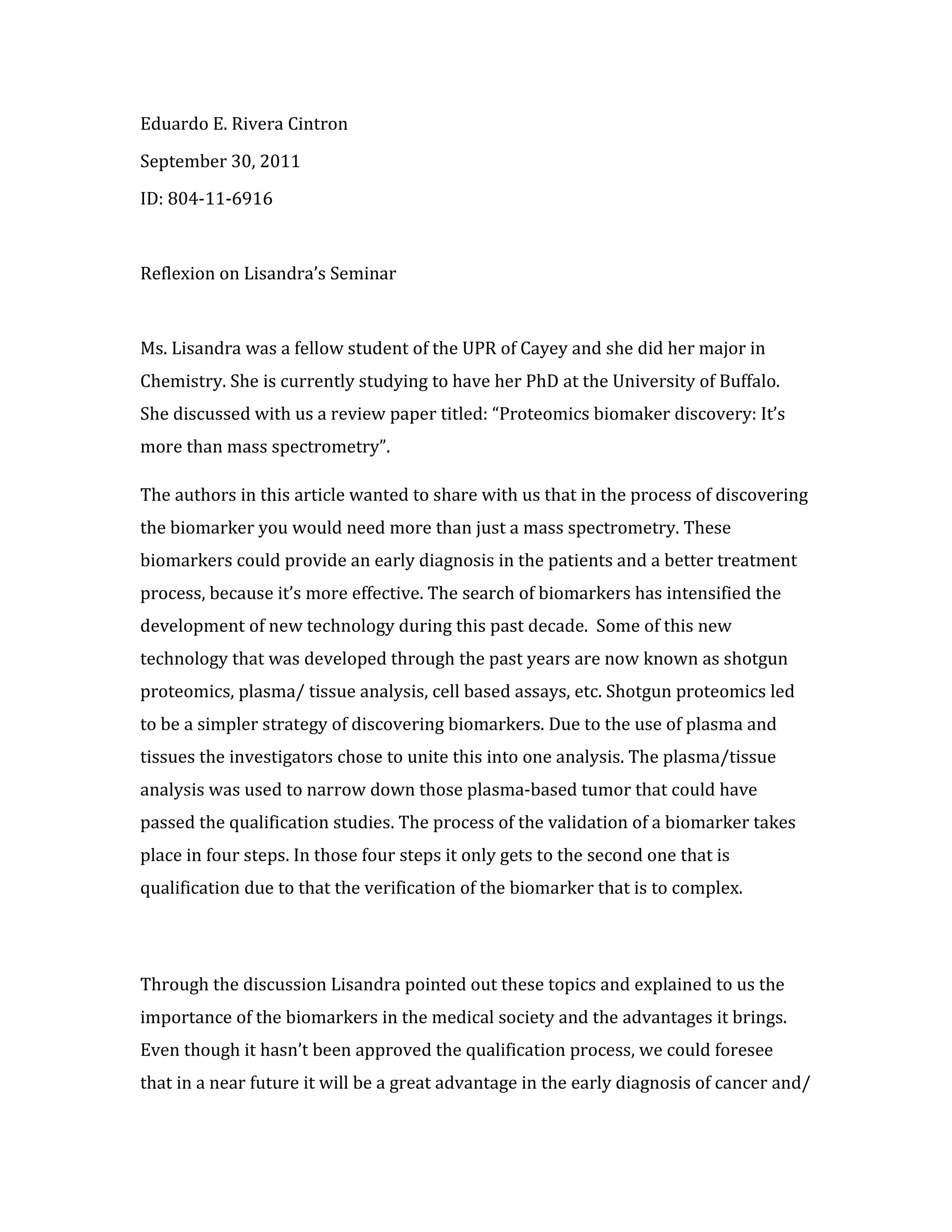 Lisandra, a fellow student studying for her PhD at the University of Buffalo, discussed a review paper titled "Proteomics biomaker discovery: It's more than mass spectrometry" with Eduardo Rivera Cintron and other students. The paper argues that discovering biomarkers requires more than just mass spectrometry and that biomarkers could enable earlier disease diagnosis and improved treatment. It also describes new proteomics technologies developed in recent decades like shotgun proteomics and plasma/tissue analysis that have aided biomarker discovery. However, the biomarker validation process is complex and typically only reaches the qualification step.