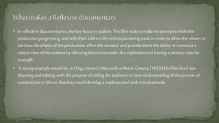 The document discusses reflective documentaries and provides examples. Reflective documentaries focus on realism by not hiding production techniques and addressing how they affect the content. For instance, Dziga Vertov's 1929 film Man with a Movie Camera filmed the crew to help viewers understand the construction process. Examples of reflective filmmaking today include the MTV show Catfish, which portrays the production process as half the focus as it tracks online relationships. Louie Theroux's documentaries also employ reflection through his impartial interviews and context about interviewee conduct.