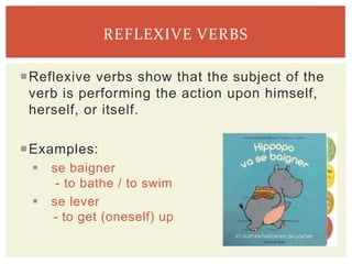 This document discusses reflexive verbs in French. It explains that reflexive verbs show that the subject is performing the action on itself. It provides examples of common reflexive verbs like se baigner, which means "to bathe." It then discusses how to conjugate reflexive verbs, including changing the reflexive pronoun to agree with the subject and conjugating the infinitive verb form. It also covers placing the reflexive pronoun and exceptions, negative forms of reflexive verbs, and notes that many reflexive verbs can also be used non-reflexively with a change in meaning.