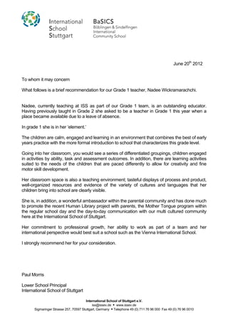 Nadee Wickramarachchi is an outstanding Grade 1 teacher at the International School of Stuttgart. She creates a calm, engaging learning environment that combines early childhood practices with formal school introduction. Her classroom displays student work and resources that represent the diversity of cultures and languages of her students. She also promotes parental involvement in programs. The principal recommends her for a teaching position at the Vienna International School due to her commitment to growth, teamwork, and international perspective.