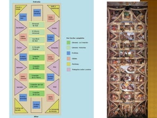 LA CAPELLA SIXTINA Autor : Miquel Àngel (1475-1564) Va treballar per la família Mèdici de Florència, quan va morir el seu mecenes es trasllada a Bolonya i finalment a Roma, on va treballar pel Papat. Tècnica: pintura al fresc Mides: 13 x 36 m (volta) i 13 x 12 m (absis) Temàtica: històries de la Bíblia. 2n autor: Daniele da Volterra (1509-1566) Pintor i escultor manieritsta italià. Associat a l’obra de Miquel Àngel pq moltes obres seves es basen en disenys fets per Miquel Àngel. - sobrenom: Il Braghettone , pq va cobrir els genitals de El Judici Final, segnt l’encàrrec del Papa Pius V. Capella Sixtina : lloc on es celebra el conclave la reunió del Col·legi de Cardenals de l’Església Catòlica Romana per escollir el nou Bisbe de Roma, càrrec que té també la funció de Papa (Sumo Pontífice i Pastor Suprem de l’Esglésica Cat`lica) i Cap de l’Estat del Vaticà. Nom: cum clavis (sota clau) reclusió i aïllament per l’elecció del nou Papa. Fumata blanca : HABEMUS PAPAM es cremen les paperetes amb palla seca. Si no hi ha elecció es cremen amb palla molla: fum negre. Recomanació pel·lícula: Les sandàlies del pescador (1968)