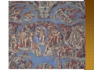 LA CAPELLA SIXTINA.EL JUDICI FINAL Figura central: Crist Jutge, envoltat d’una cort de profetes, apòstols i sants. Destaquem: sant Pere (porta les claus), sant Llorenç i sant Bartolomeu (als peus de Crist, amb els símbols del martiri: graella i la pròpia pell). Esquerra Messies: condemnats a l’infern, llançats per àngels justiciers. Infern: Caront (mitologia grecoromana) amb la barca porta les ànimes impures davant el jutge infernal Minos (amb serps al cos) i davant el Leviatan (monstre marí, visió de Job). Dreta: els salvats pugen al cel, s’ajuden. Part superior: àngels que porten els símbols de la Passió de Crist: la columna, la creu, els claus i la corona d’espines. Relació amb Judici d’Osiris (mitologia egípcia)