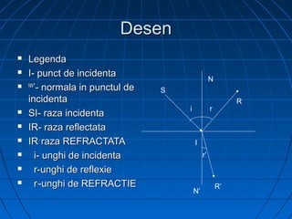 Refracția luminii este schimbarea direcției de propagare a acesteia atunci când trece dintr-un mediu transparent în altul. Există legi ale refracției care stipulează că raza incidentă, raza refractată și normala se află în același plan, iar unghiurile de incidență și refracție nu sunt congruente. Indicele de refracție al unui mediu este definit prin raportul dintre viteza luminii în vid și viteza acesteia în mediul respectiv.