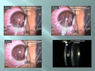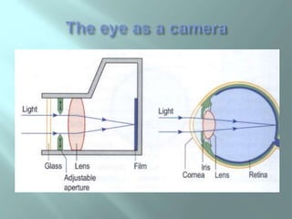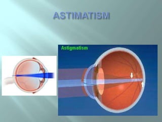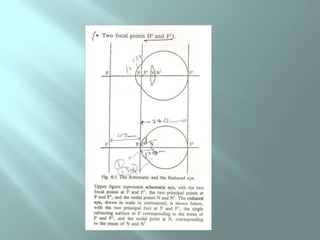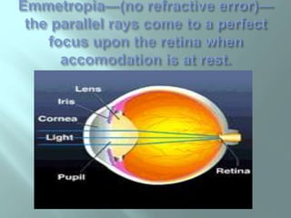 This document discusses the optical system of the eye and various types of refractive errors. It begins by explaining how the cornea and lens are responsible for most of the eye's refractive power. It then discusses schematic eyes and different types of ametropia including myopia, hypermetropia, and astigmatism. The document provides details on causes, symptoms, signs, and treatment options for each refractive error.