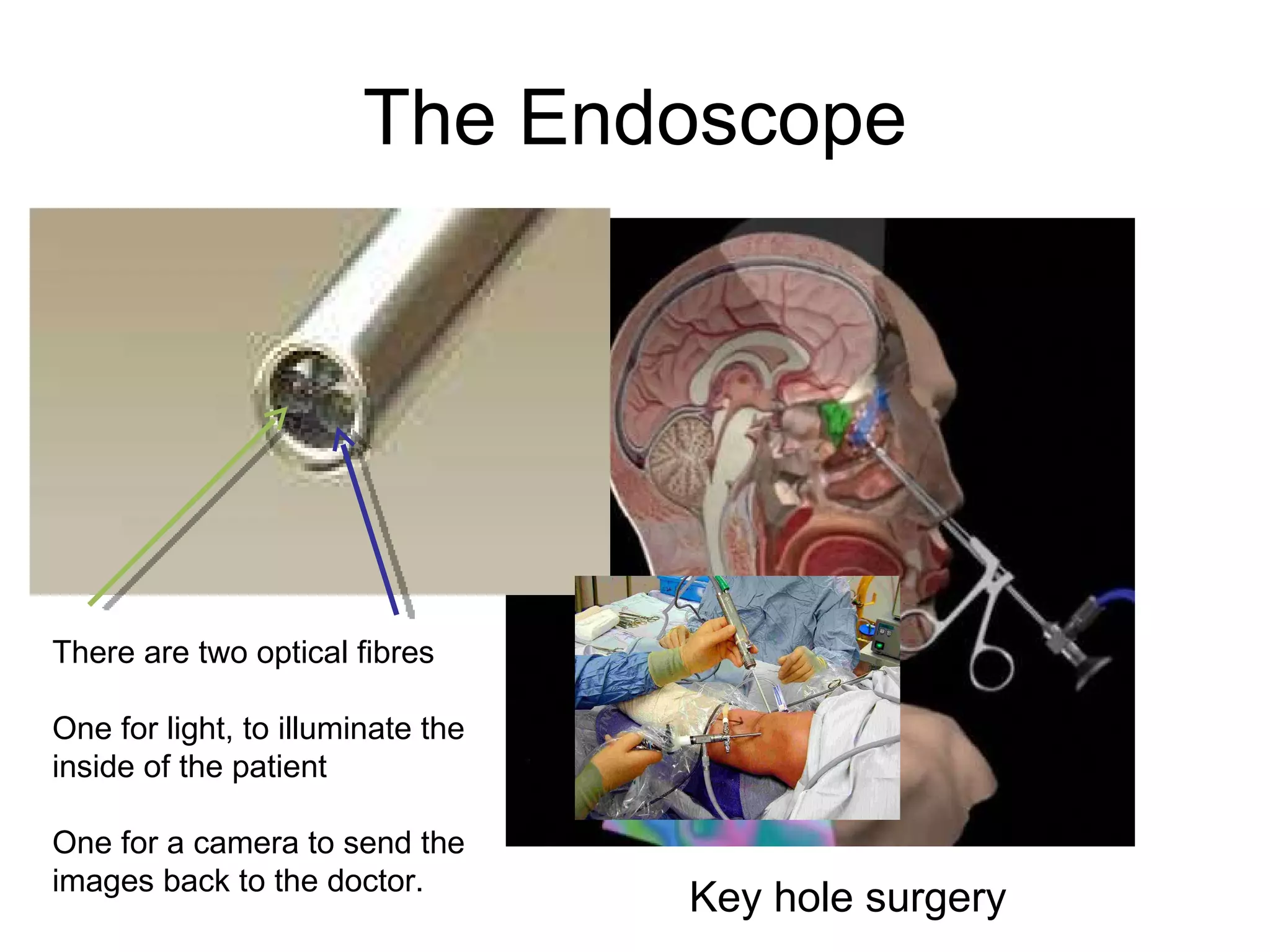 1) Keyhole surgery involves using two optical fibers - one to illuminate the inside of the patient and one for a camera to send images back to the doctor, allowing surgery to be performed through small incisions.
