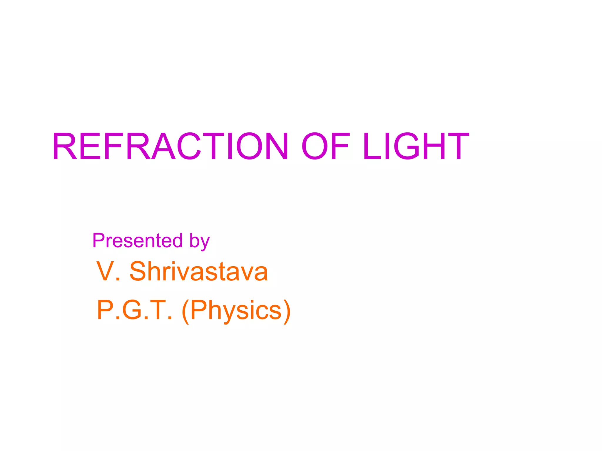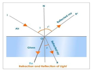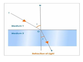 This document discusses the refraction of light. It defines refraction as the change in direction of light when passing from one medium to another. It states that light bends away from the normal when traveling to a less dense medium, and toward the normal when traveling to a denser medium. Snell's law is introduced, which states that the ratio of sines of the angle of incidence and refraction is a constant. Refractive index is defined as the ratio of speed of light in a vacuum to that in a medium. Lens equations and image formation by convex and concave lenses are briefly covered.