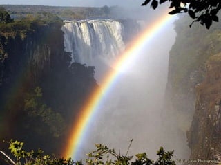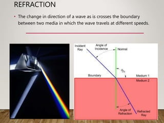 Refraction is the change in direction of a wave when it passes from one medium to another with a different speed. The index of refraction is the ratio of light's speed in a vacuum to its speed in a medium, and it determines how much light will bend at the boundary. Snell's law relates the sines of the angles of incidence and refraction to the indices of refraction. Total internal reflection occurs when light travels from a denser to a less dense medium at an angle greater than the critical angle, causing the light to be reflected back into the denser medium. Converging lenses bring light rays passing through the focal point to a focus on the opposite side, while diverging lenses spread out light rays