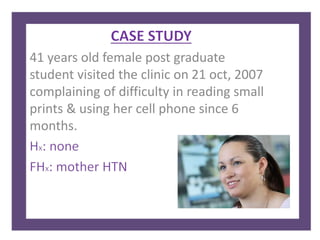 A 41-year-old female presented with difficulty reading small prints and using her cellphone for 6 months. She was diagnosed with hyperopic presbyopia but returned with worsening vision. Her blood sugar was found to be elevated, diagnosing her with diabetes mellitus. Diabetes can cause refractive changes, cataracts, and retinopathy due to physiological changes in the eye. A full ocular examination is important for managing diabetic patients.