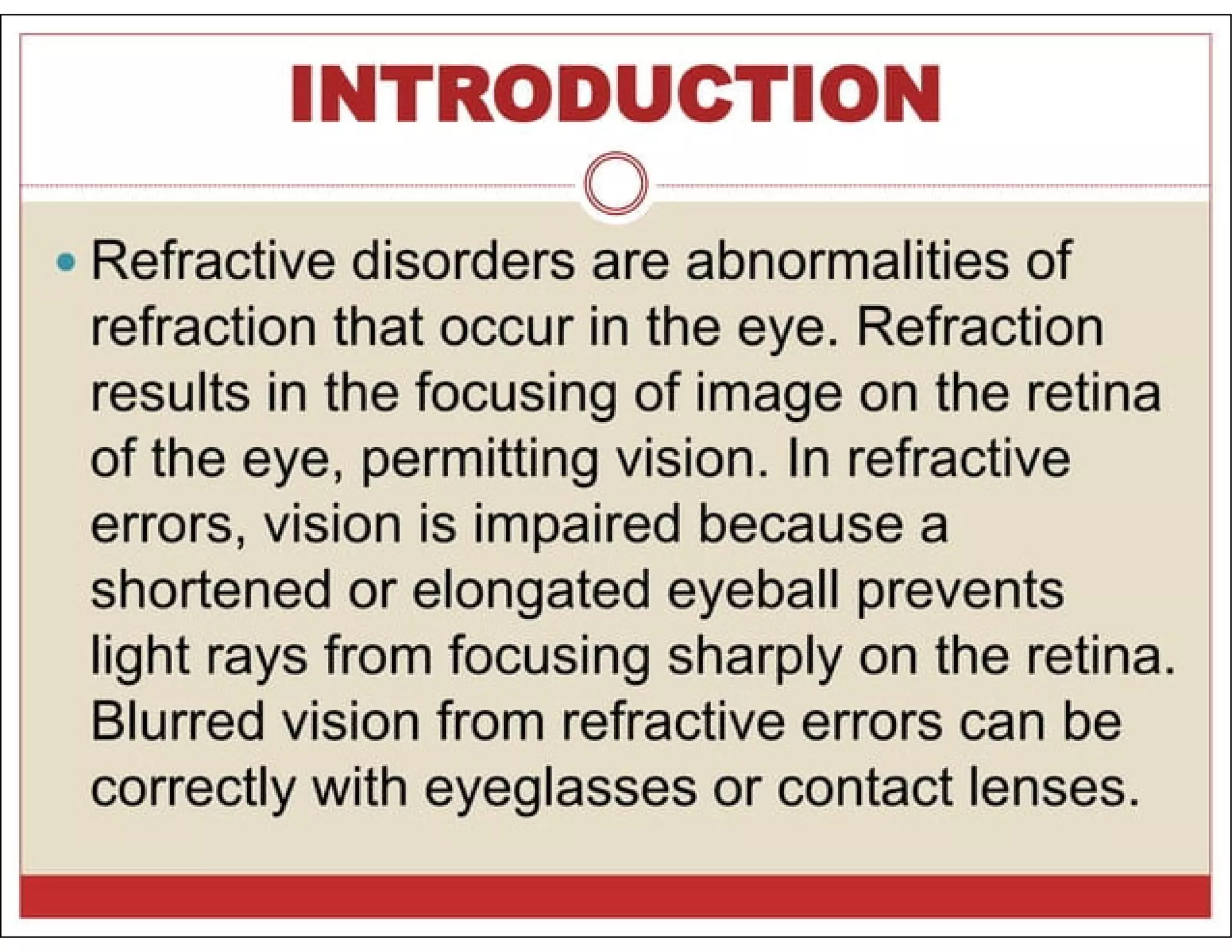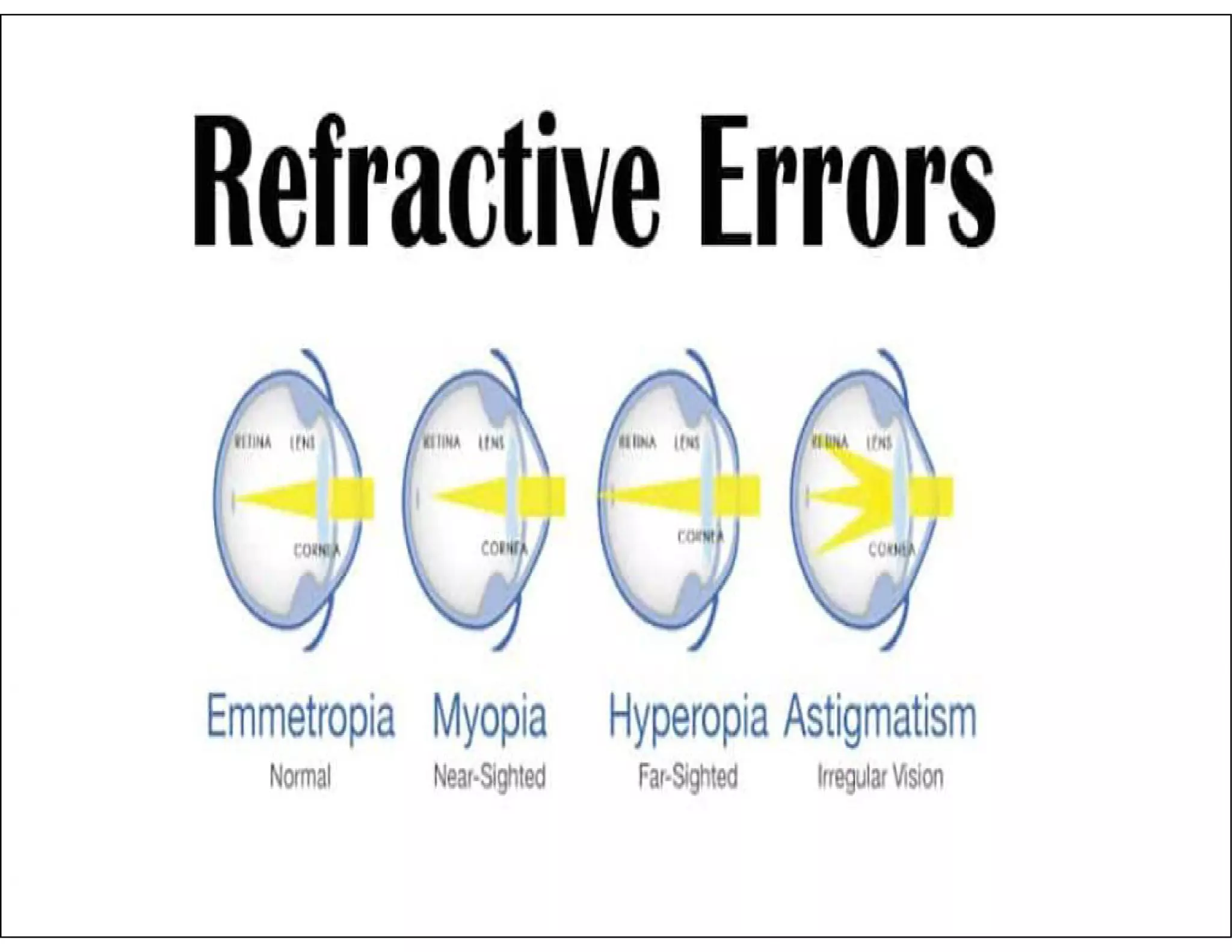 1. Refractive errors occur when the eye is unable to correctly focus light on the retina, resulting in blurred vision. The main types are myopia, hyperopia, presbyopia, and astigmatism.