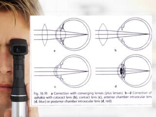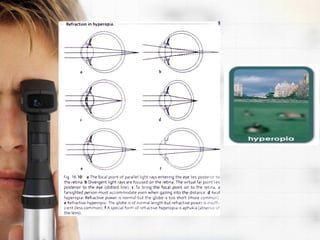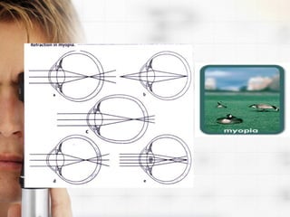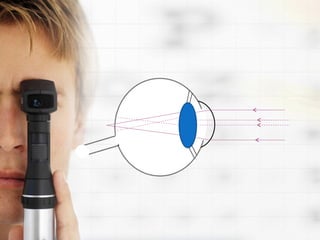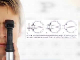 Refractive errors occur when there is a mismatch between the eye's optical power and its axial length, causing light rays to focus in front or behind the retina. The most common refractive errors are myopia, hyperopia, and astigmatism. Diagnosis involves using instruments like autorefractors and retinoscopes to measure how light enters the eye. Optical corrections include spectacle lenses, contact lenses, and intraocular lenses, with the type chosen based on factors like comfort, durability, and amount of correction needed.