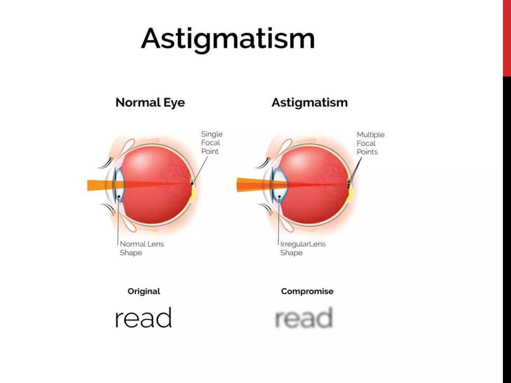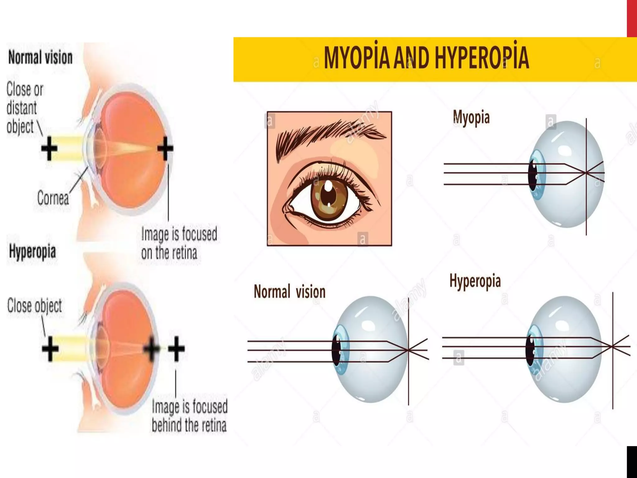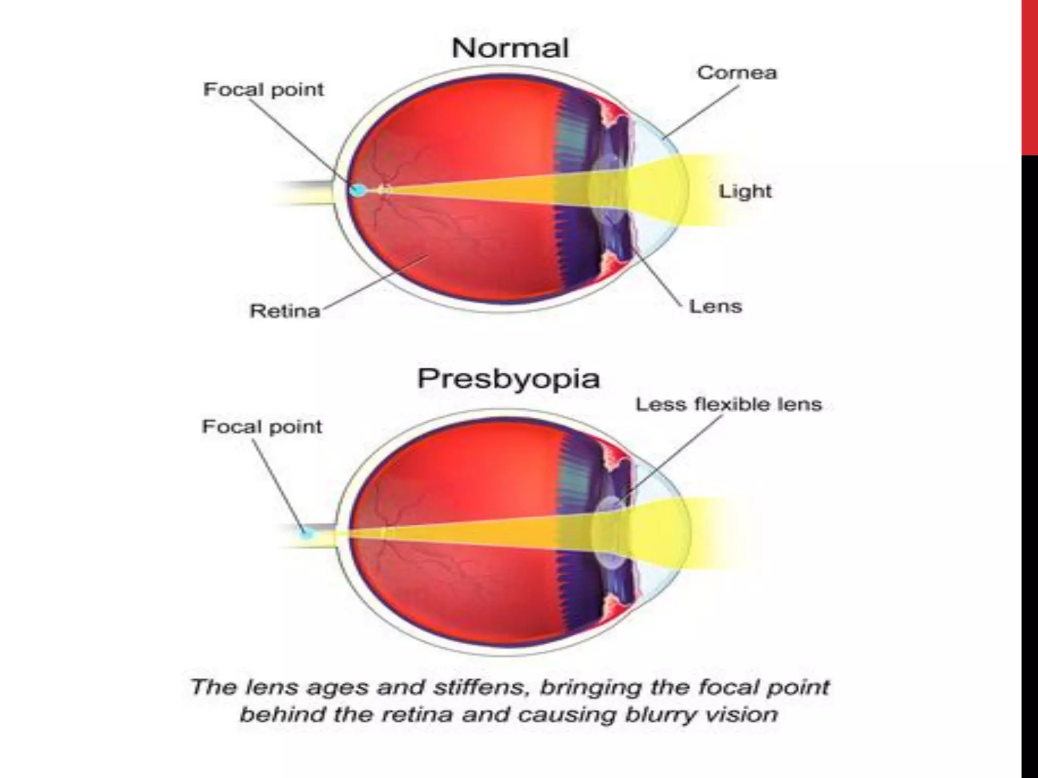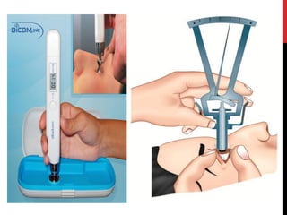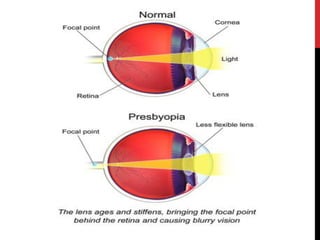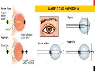 This document discusses various types of refractive errors including myopia, hyperopia, presbyopia, and astigmatism. It describes the causes, clinical features, diagnostic evaluations including history, slit lamp exam, and tonometry, and management including pharmacological treatments, and surgical procedures like LASIK and LASEK. Nursing management focuses on safely administering treatments, monitoring vitals, and observing patients for side effects and responses to treatment.