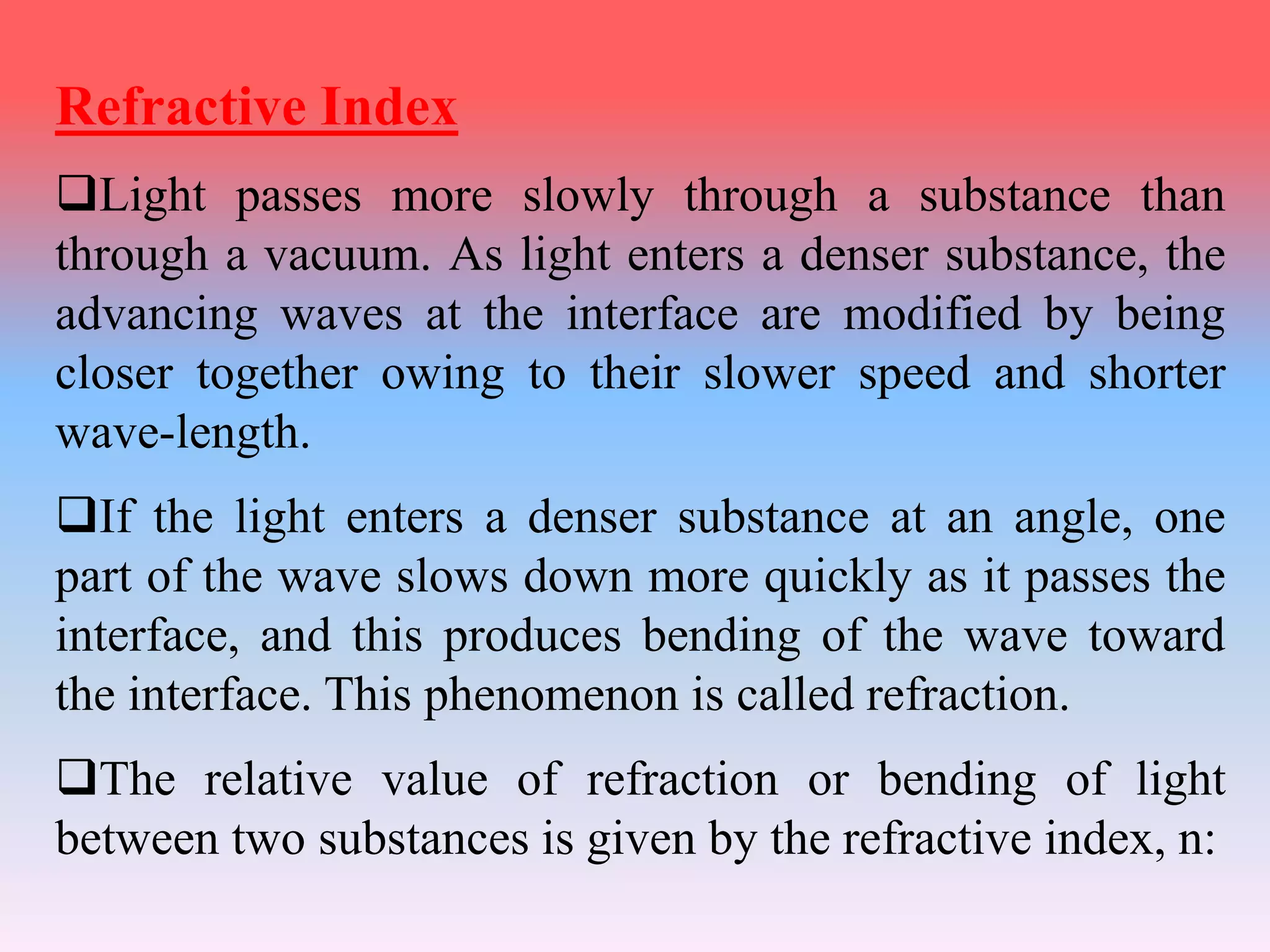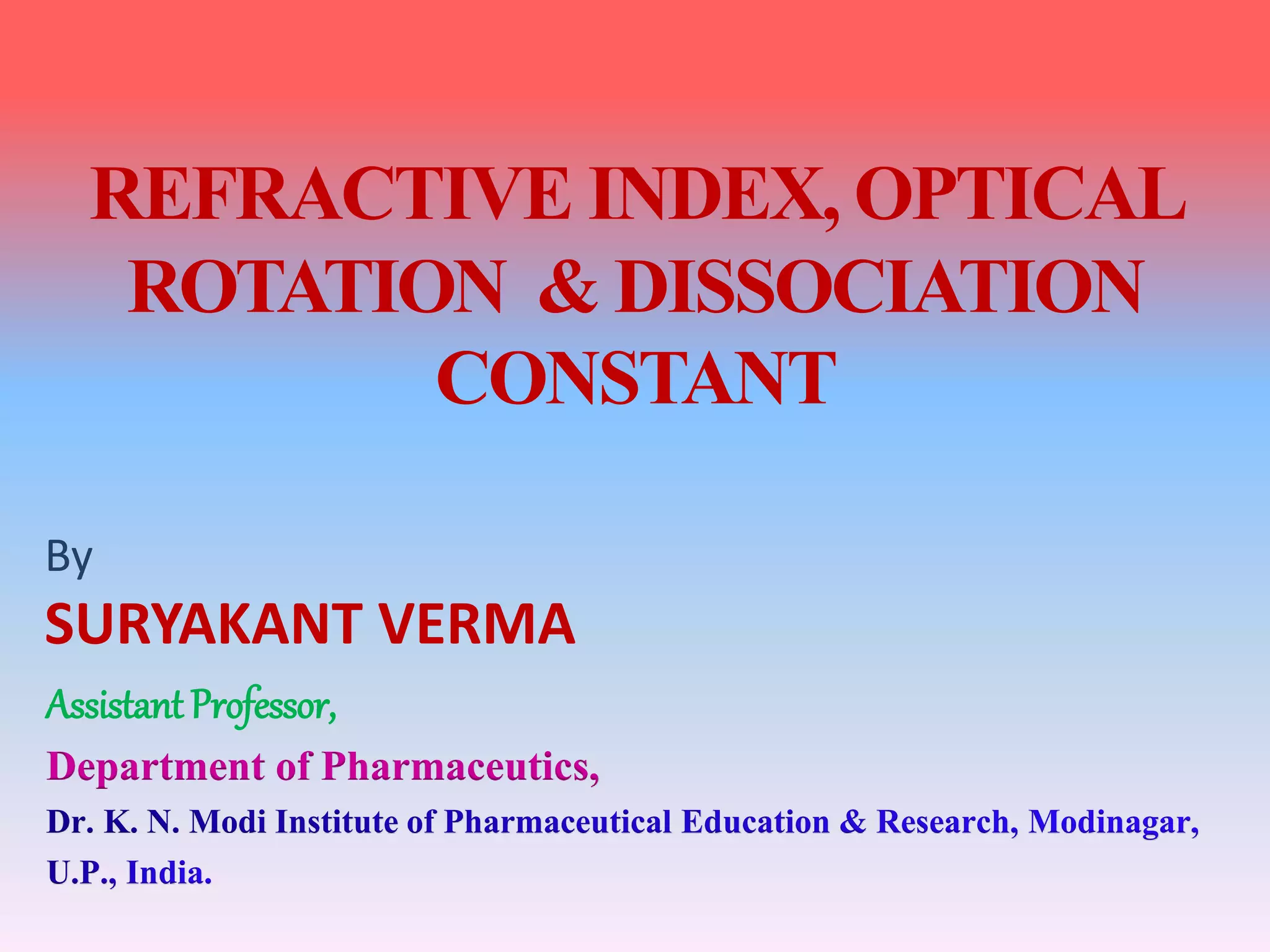 This document discusses refractive index, optical rotation, and dissociation constant. It defines refractive index as a ratio of the speed of light in a vacuum to the speed of light in a medium. It explains that optical rotation is the rotation of the plane of polarized light when it passes through certain chiral materials. It also defines dissociation constant as a quantity expressing the extent to which a substance dissociates into ions in solution. Various techniques for measuring refractive index and applications of optical rotation and dissociation constants are also summarized.