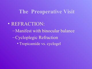 The document outlines essential aspects of refractive surgery, including preoperative evaluations and the surgical procedure using both traditional microkeratomes and the all-laser intralase method. It highlights the importance of assessing individual patient needs, managing potential complications, and ensuring proper postoperative care. Key considerations include pupil size, ablation zone, and the management of various eye health issues and systemic diseases that could affect surgical outcomes.