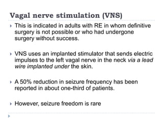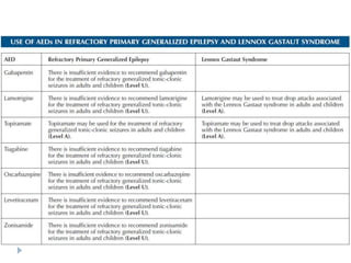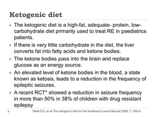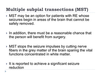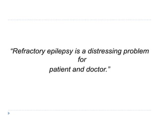 This document summarizes information about refractory epilepsy. It begins by defining refractory epilepsy as persistent seizures under antiepileptic drug treatment. It then discusses predictive factors of refractory epilepsy like epileptic syndrome, response to previous drugs, age at onset, and structural brain abnormalities. The document outlines evaluation and management approaches including optimizing medical treatment, surgical options like resection or palliation procedures, and other therapies like the ketogenic diet.