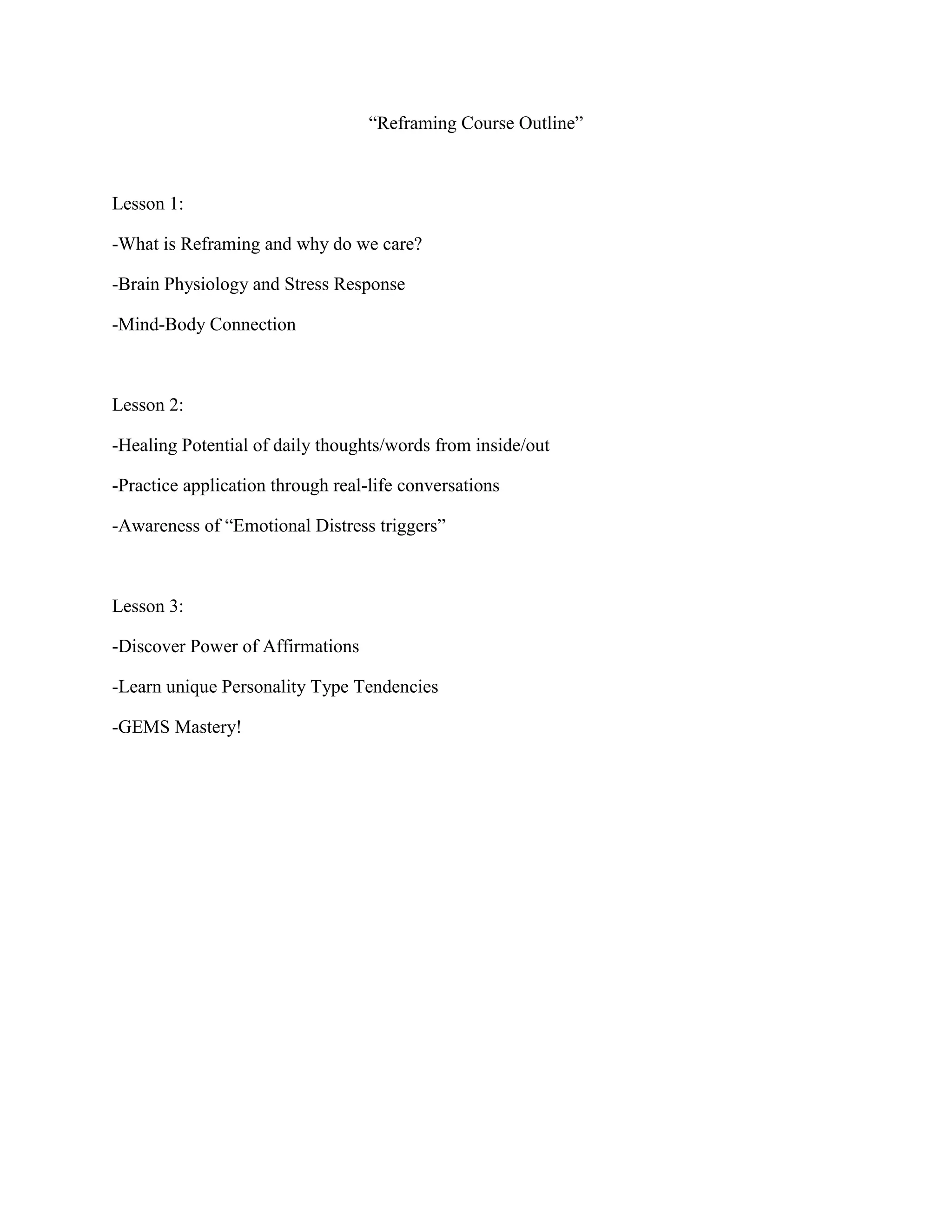 This 3 lesson course on reframing teaches how to manage stress responses and heal through daily thoughts, words, and awareness of emotional triggers. Lesson 1 covers what reframing is and its importance, as well as brain physiology and the mind-body connection. Lesson 2 focuses on the impact of daily thoughts and words, applying reframing to conversations, and identifying emotional distress triggers. Lesson 3 explores the power of affirmations, learning personality type tendencies, and mastering GEMS.