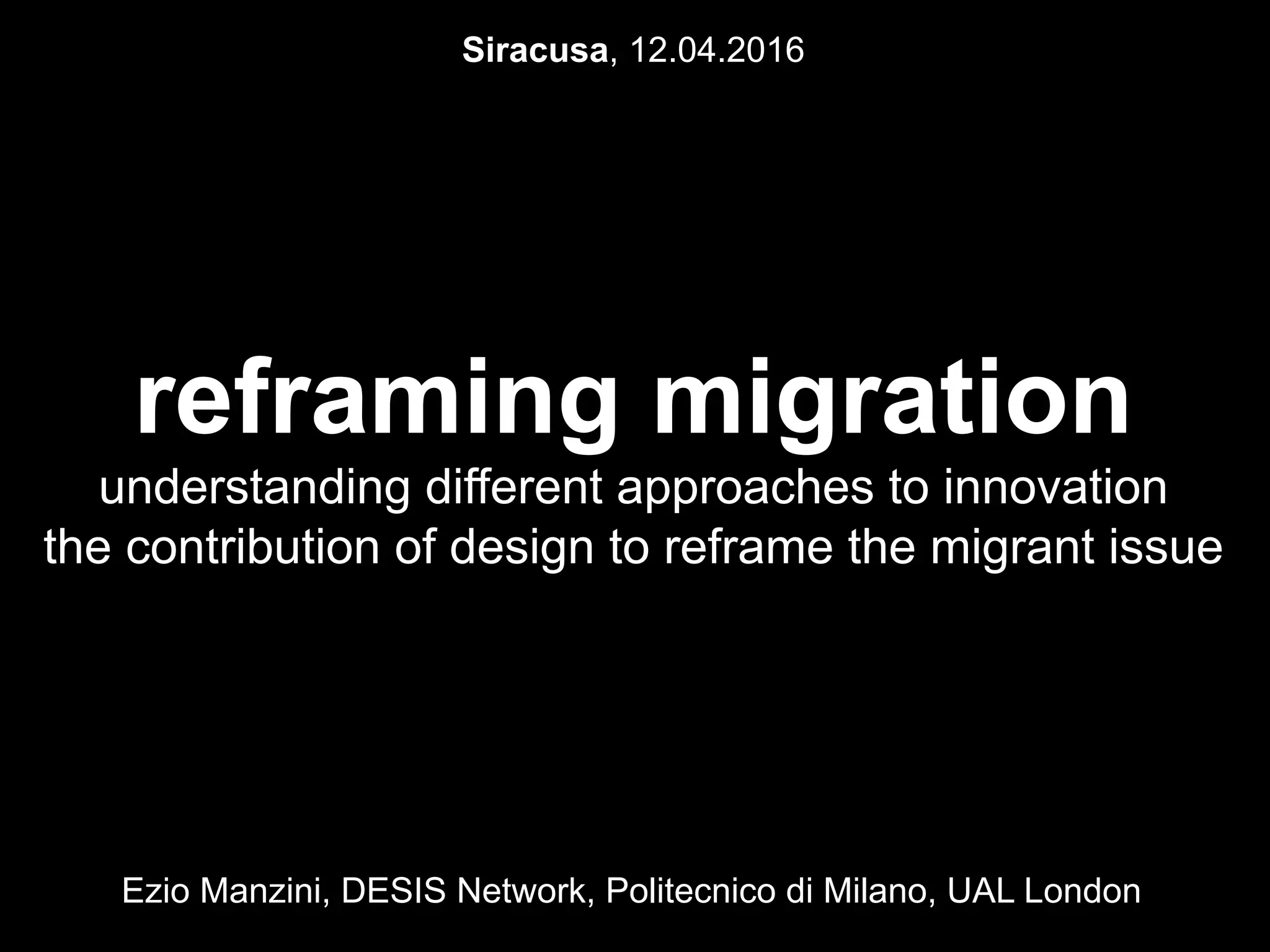 Il documento esplora l'innovazione sociale e il design nel contesto delle migrazioni, evidenziando l'importanza di approcci umani e collaborativi. Propone soluzioni pratiche per affrontare le sfide migratorie e promuovere la coesione sociale attraverso iniziative comunitarie e servizi integrativi. Viene sottolineata la necessità di riformulare il modo in cui percepiamo i migranti, trattandoli come individui con risorse e potenziali da valorizzare.