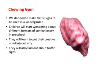 The team plans to make traffic sign crafts with kindergarteners using everyday materials like chewing gum and paper plates. The children will learn about different types of confectionary, use their creativity, and discover what traffic signs mean by chewing gum, sticking it to plates to make signs, and painting them together with guidance from the team.