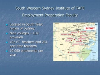 This document discusses the efforts of a group called National Change Agents at the South Western Sydney Institute of TAFE Employment Preparation Faculty. The Change Agents aimed to strengthen client focus, diversify literacy and numeracy services, and encourage innovation. They formed partnerships, gathered feedback, and developed new projects. This led to greater practitioner engagement in change efforts, new literacy programs and products based on student input, and $30,000 in funding for innovative initiatives. The takeaway is that change agents can empower others to lead planned and emergent change through relationships and capturing people's talents.