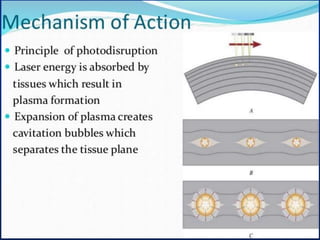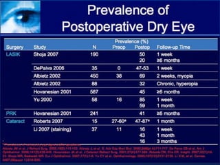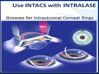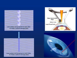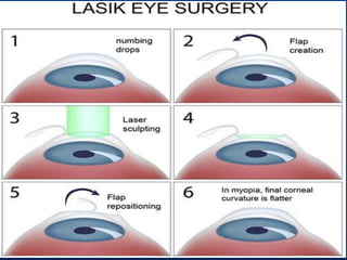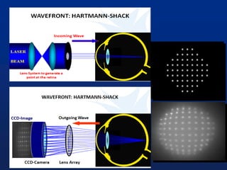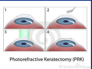 This document discusses various refractive surgery procedures used to correct refractive errors of the eye, including incisional keratotomy techniques, lamellar procedures, laser ablation procedures, corneal implants, and lens-based procedures. It provides details on common procedures like radial keratotomy, LASIK, PRK, and LASEK. It covers patient evaluation, surgical techniques, potential complications, and advantages of different approaches. Wavefront-guided customized excimer laser surgery is also introduced to correct higher-order aberrations in addition to spherical and cylindrical errors.