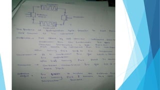 This document summarizes key concepts in refrigeration cycles. It defines refrigeration as reducing the temperature below the surroundings and notes that refrigerants, like NH3, are used as working fluids. It explains that the refrigerating effect is the energy removed from the cold chamber and that the coefficient of performance is the ratio of heat removed to work input. The document also discusses refrigerator capacity as the amount of heat transferred per unit time from the cold chamber. It provides an overview of the vapor compression refrigeration cycle and notes modifications to improve efficiency, such as replacing the expansion engine with a throttling valve.