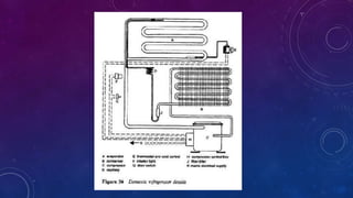 Refrigeration is a process that uses mechanical work to move heat from one location to another in a controlled manner, with applications including household refrigerators, freezers, air conditioning, and more. A refrigerator contains internal parts like refrigerant, a compressor, condenser, evaporator, and thermostat that circulate refrigerant to absorb heat from the refrigerator compartment and expel it outside. External parts include the freezer and refrigerator compartments, temperature controls, crisper, door shelves, and an interior light controlled by a switch. Refrigeration has had significant impacts on industry, lifestyle, agriculture, and development.