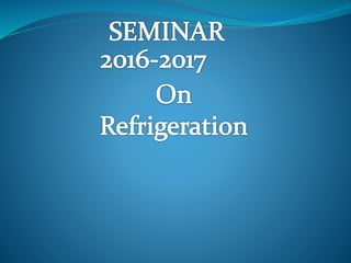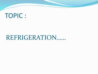 The document provides an overview of refrigeration systems, focusing on vapour compression and absorption refrigeration methods, along with their advantages. It details the types of refrigerants used, specifically chlorinated fluorocarbons, and introduces key concepts like the assessment of cooling effects and the coefficient of performance (COP). The content includes equations and measures related to refrigeration efficiency and performance assessment.