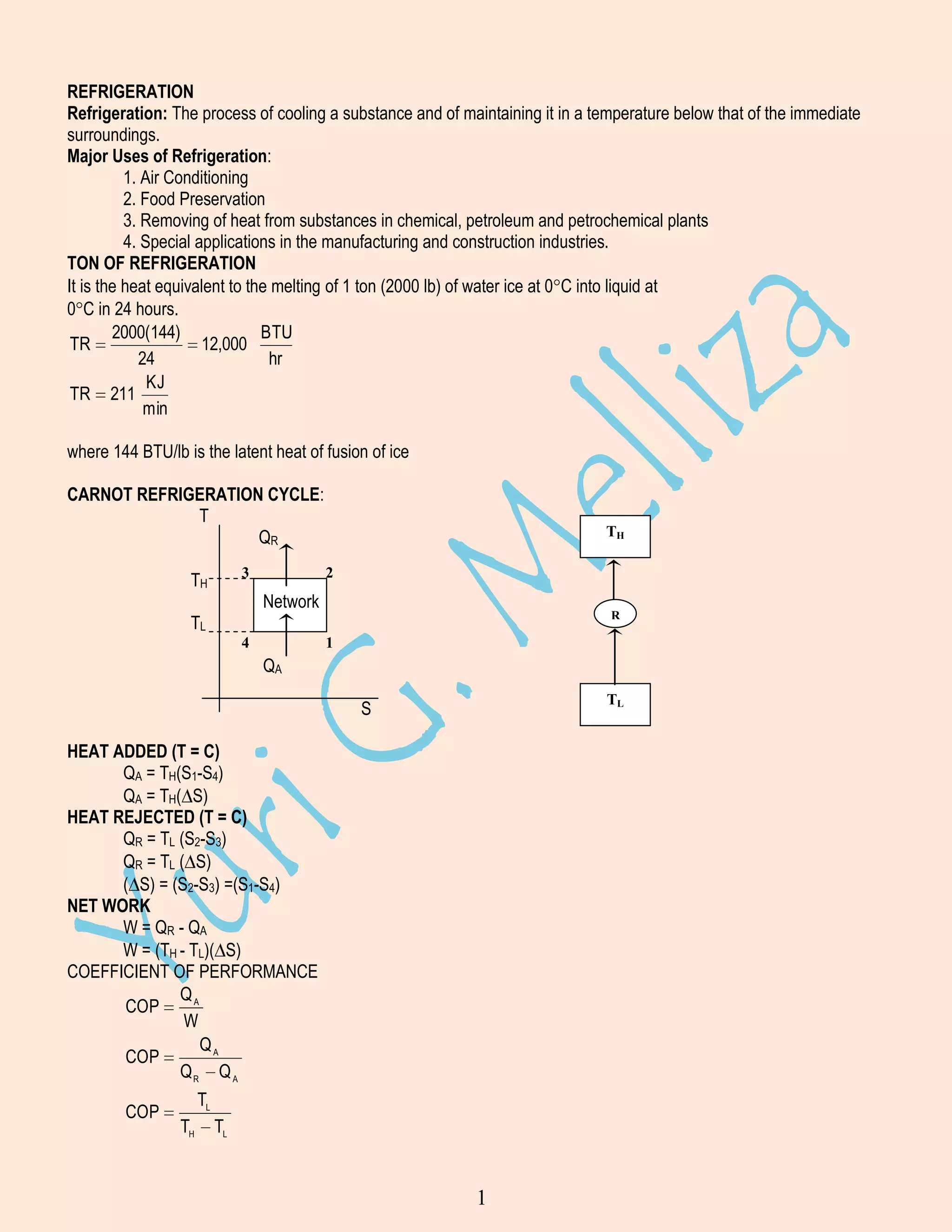 1. Refrigeration is defined as the process of cooling a substance below the temperature of its surroundings. Major uses include air conditioning, food preservation, and industrial processes.
