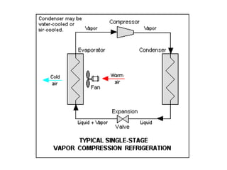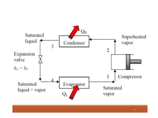 The document outlines refrigeration and air conditioning, defining refrigeration as removing unwanted heat and air conditioning as controlling temperature, humidity, and air quality. It details applications of air conditioning and the standard unit of refrigeration, ton refrigeration (tr), along with calculations for refrigeration effect and coefficient of performance (COP). Additionally, it describes types of refrigeration systems like vapor compression and vapor absorption, along with ideal refrigerant properties and refrigeration cycles.