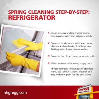 Your refrigerator houses most of your food and perishables - so it's important to ensure you clean it periodically. Check out hhgregg's quick tips for cleaning your refrigerator to see how you can dust, vacuum, wipe down important sections of refrigerator to keep it clean and keep your food safe. For more tips on cleaning your major appliances, visit our blog: http://blog.hhgregg.com/spring-cleaning-appliances/
